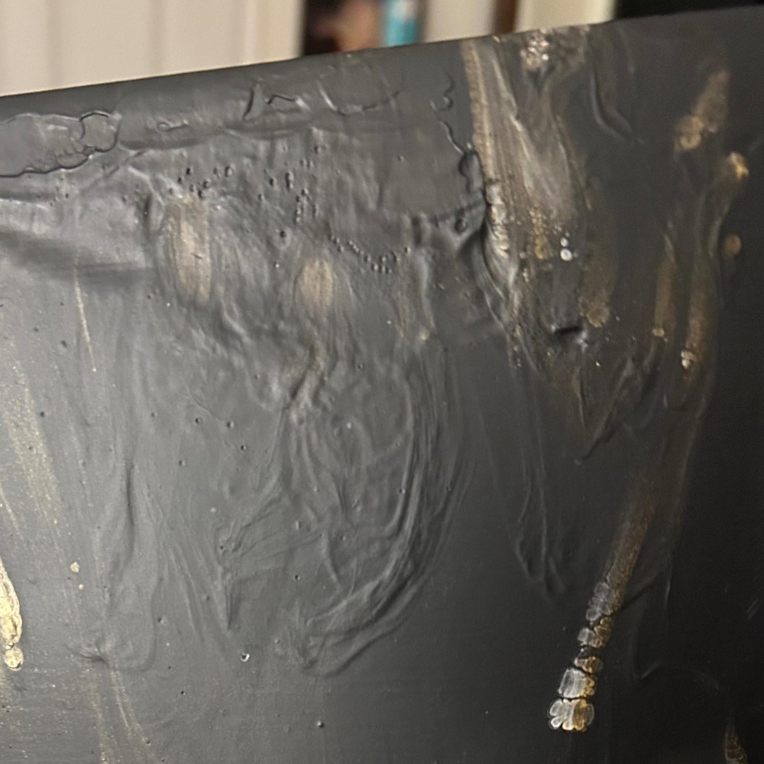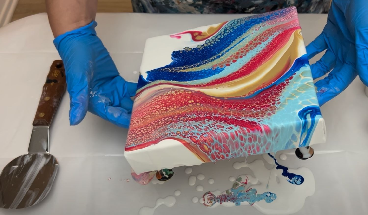 If you’re doing a technique that requires thick paint and you’re getting cracks, try stretching out your design by tilting or spinning a little more to get some of the excess paint off the canvas.